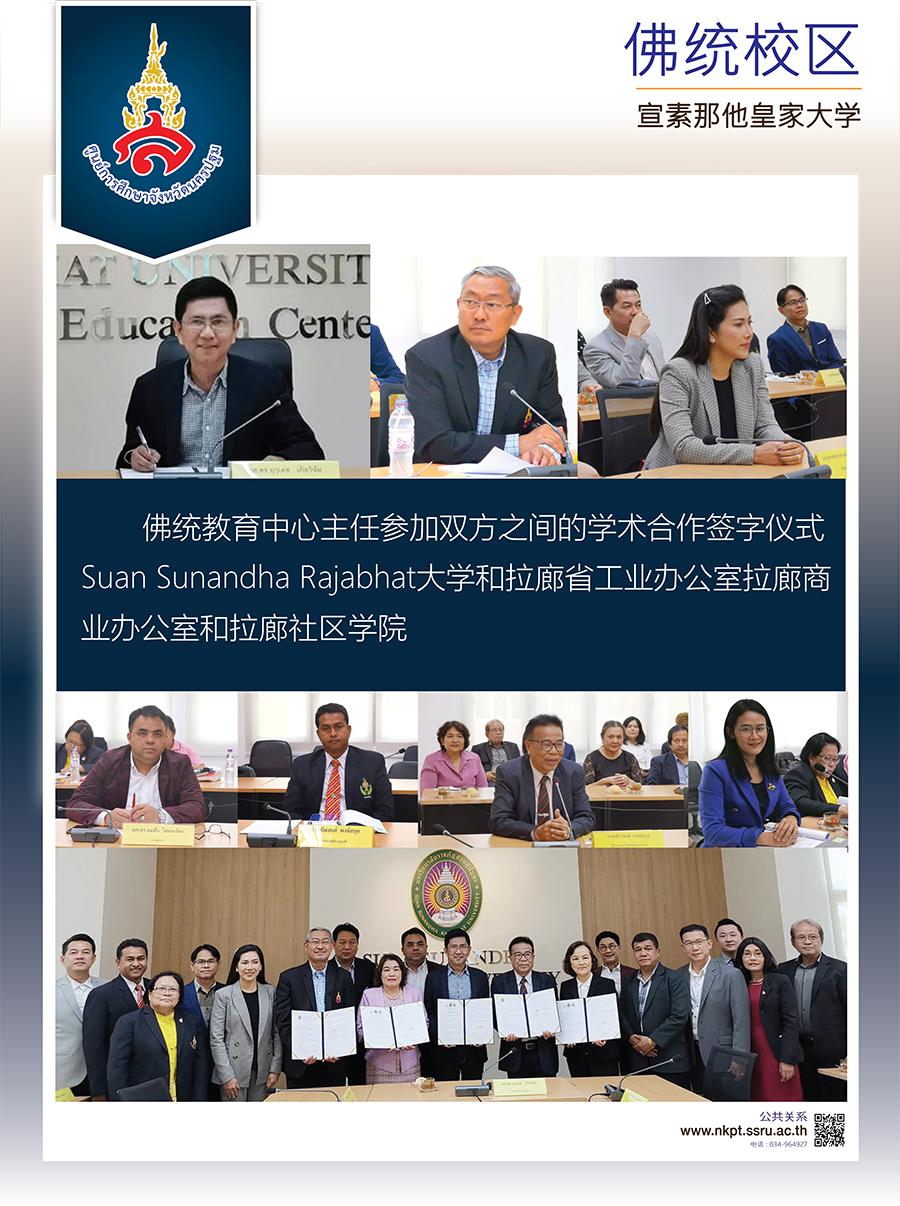 > 佛统教育中心主任参加双方之间的学术合作签字仪式Suan Sunandha Rajabhat大学和拉廊省工业办公室拉廊商业办公室和拉廊社区学院