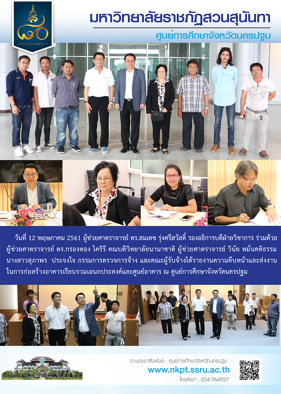 วันที่ 12 พฤษภาคม 2561 ผู้ช่วยศาตราจารย์ ดร.สมเดช รุ่งศรีสวัสดิ์ รองอธิการบดีฝ่ายวิชาการ ร่วมด้วยผู้ช่วยศาตราจารย์ ดร.กรองทอง ไคริรี คณบดีวิทยาลัยนานาชาติ ผู้ช่วยศาตราจารย์ วินัย หมั่นคติธรรมนางสาวสุภาพร ประจงใจ กรรมการตรวจการจ้าง และคณะผู้รับจ้างได้รายงานความคืบหน้าและส่งงานในการก่อสร้างอาคารเรียนรวมเอนกประสงค์และศูนย์อาคาร ณ ศูนย์การศึกษาจังหวัดนครปฐม
