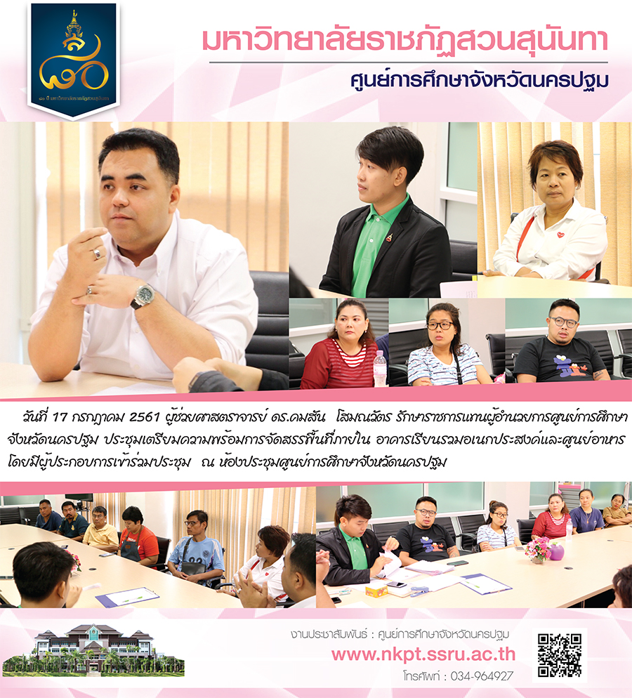 วันที่ 17 กรกฎาคม 2561 ผู้ช่วยศาสตราจารย์ ดร.คมสัน โสมณวัตร รักษาราชการแทนผู้อำนวยการศูนย์การศึกษา จังหวัดนครปฐม ประชุมเตรียมความพร้อมการจัดสรรพื้นทึี่ภายใน อาคารเรียนรวมอเนกประสงค์และศูนย์อาหาร