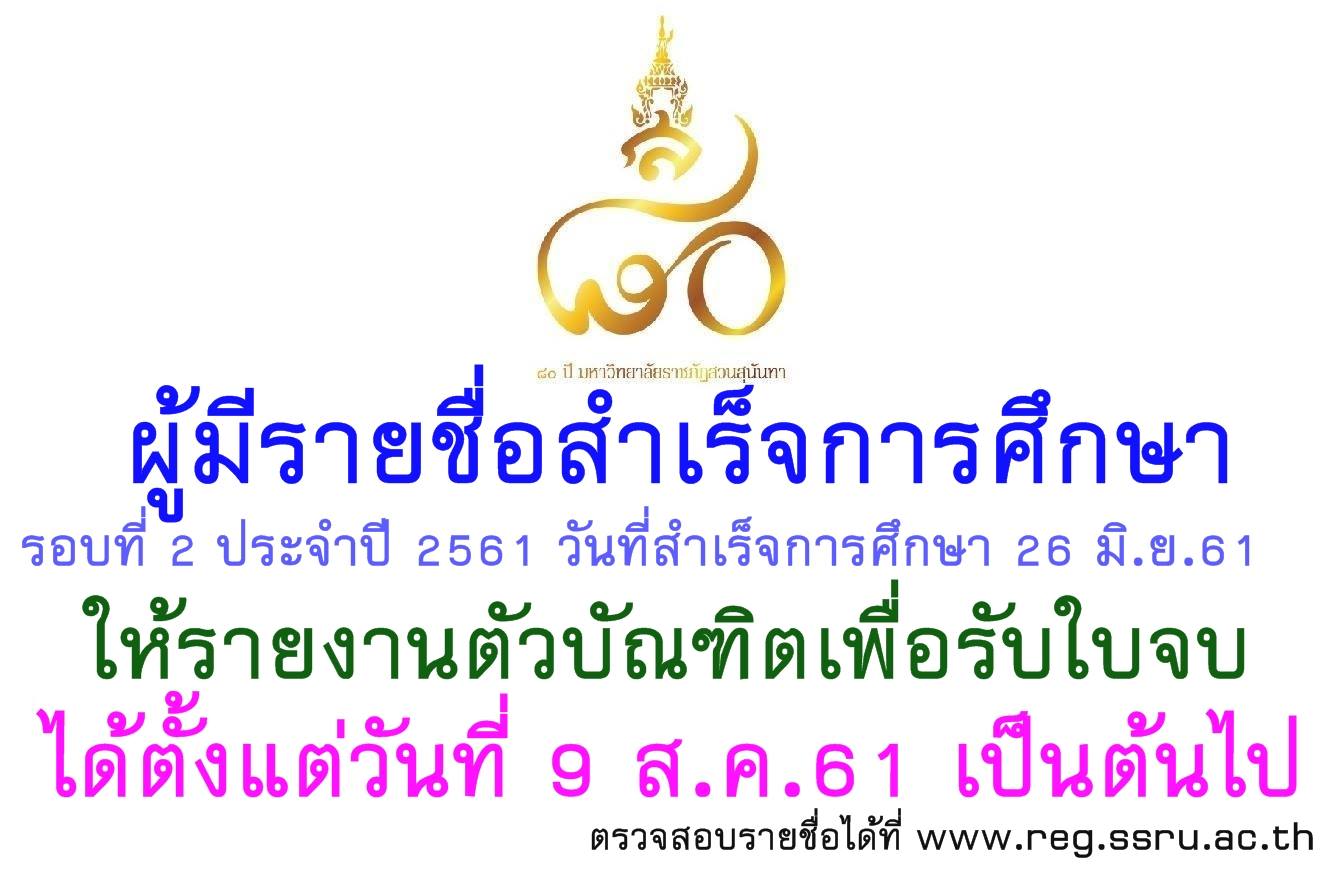 ผู้มีรายชื่อสำเร็จการศึกษารอบที่ 2 ประจำปี 2561 วันที่สำเร็จการศึกษา 26 มิ.ย. 2561 ให้รายงานตัวบัณฑิตเพื่อรับใบจบ ได้ตั้งเเต่ วันที่ 9 ส.ค. 2561 ตรวจสอบรายชื่อ ได้ที่ www.reg.ssru.ac.th