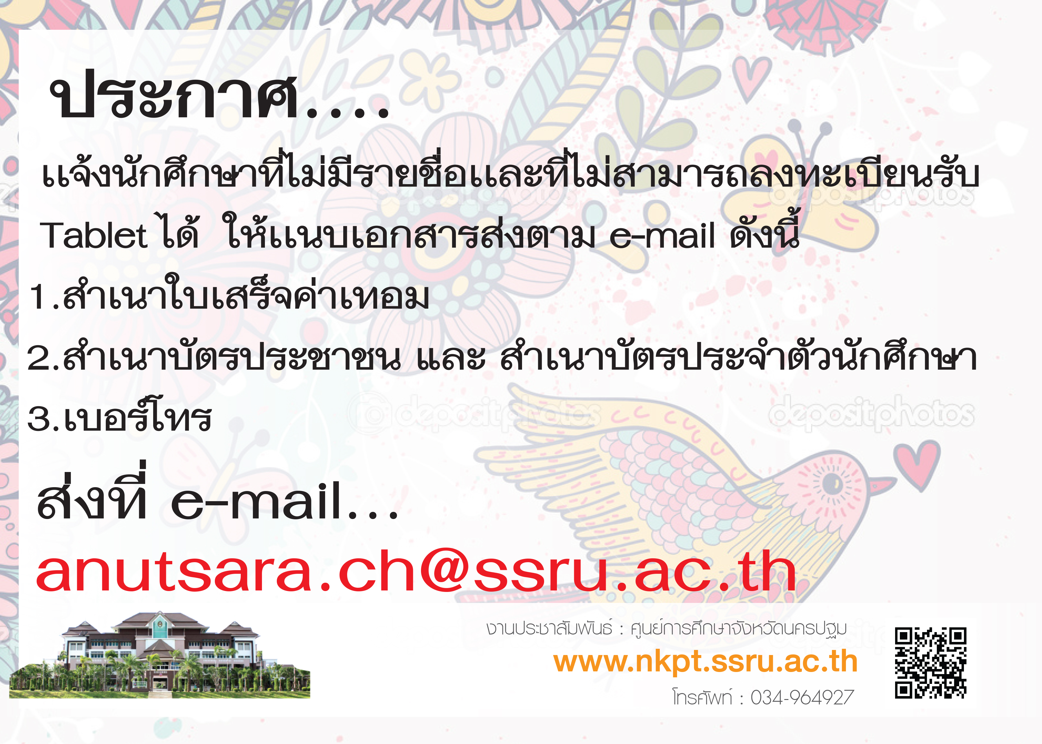 > เเจ้งนักศึกษาที่ไม่มีรายชื่อเเละที่ไม่สามารถลงทะเบียนรับ Tablet ได้ ให้เเนบเอกสารส่งตาม e-mail