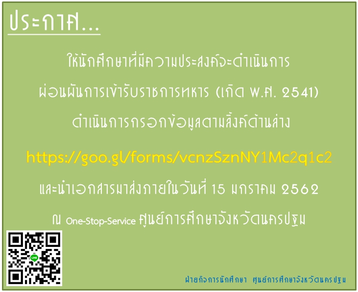 ให้นักศึกษาที่มีความประสงค์จะดำเนินการผ่อนผันการเข้ารับราชการทหารที่เกิด พ.ศ. 2541 ดำเนินการกรอกข้อมูลตามลิ้งค์ด้านล่างและนำเอกสารมาส่งภายในวันที่ 15 มกราคม 2562
