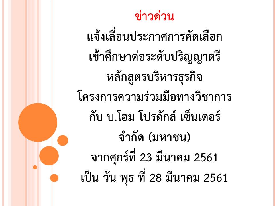 เลื่อนประกาศการคัดเลือก โครงการการร่วมมือทางวิชาการกับบริษัท โฮม โปรดักส์ เซ็นเตอร์ จำกัด (มหาชน)