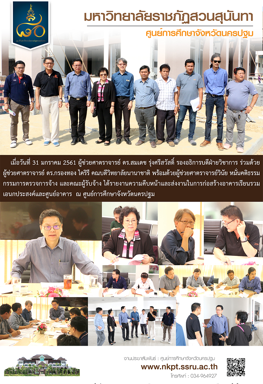 เมื่อวันที่ 31 มกราคม 2561 ผู้ช่วยศาตราจารย์ ดร.สมเดช รุ่งศรีสวัสดิ์ รองอธิการบดีฝ่ายวิชาการ ร่วมด้วยผู้ช่วยศาตราจารย์ ดร.กรองทอง ไคริรี คณบดีวิทยาลัยนานาชาติ พร้อมด้วยผู้ช่วยศาตราจารย์วินัย หมั่นคติธรรม กรรมการตรวจการจ้าง และคณะผู้รับจ้างได้รายงานความคืบหน้าและส่งงานในการก่อสร้างอาคารเรียนรวมเอนกประสงค์และศูนย์อาคาร ณ ศูนย์การศึกษาจังหวัดนครปฐม