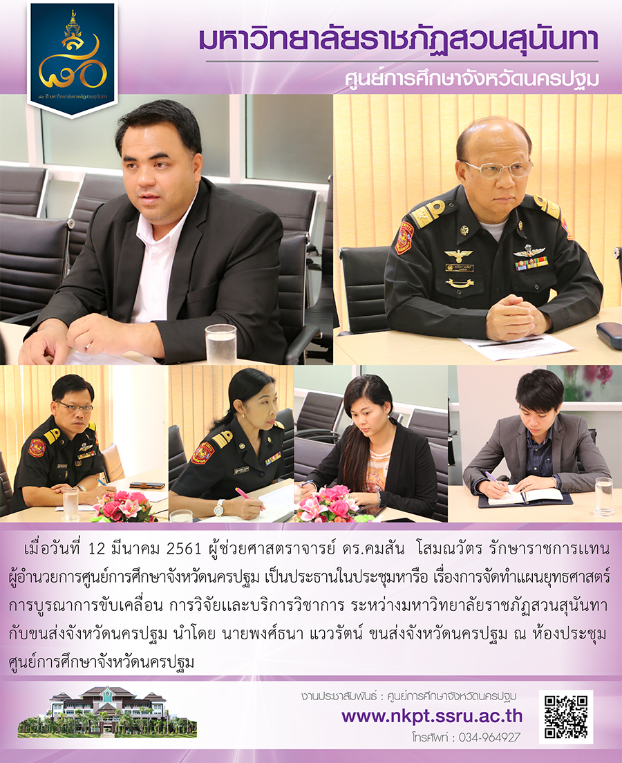 > ประชุมหารือ เรื่องการจัดทำแผนยุทธศาสตร์ การบูรณาการขับเคลื่อน การวิจัยเเละบริการวิชาการ ระหว่างมหาวิทยาลัยราชภัฏสวนสุนันทา กับขนส่งจังหวัดนครปฐม
