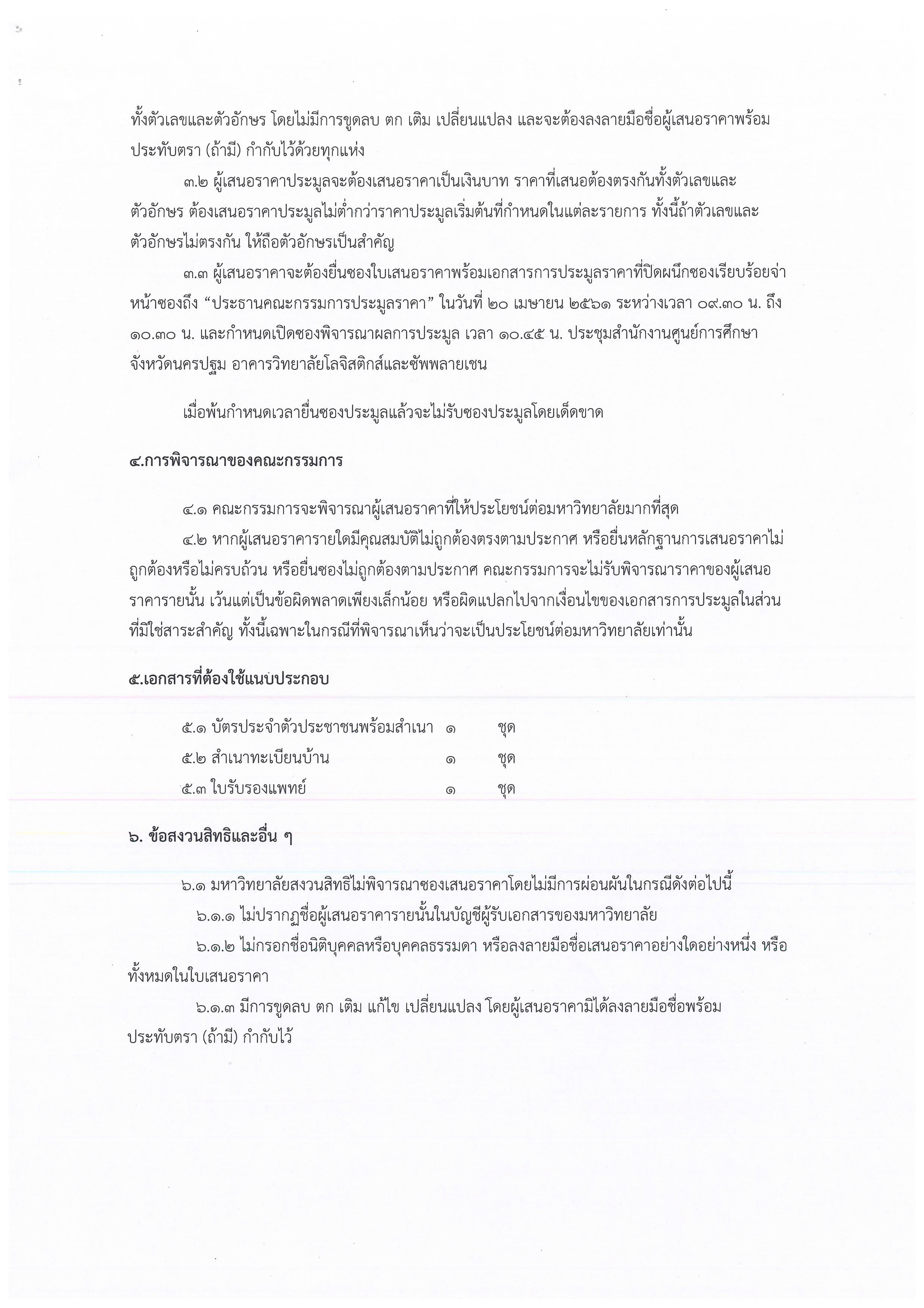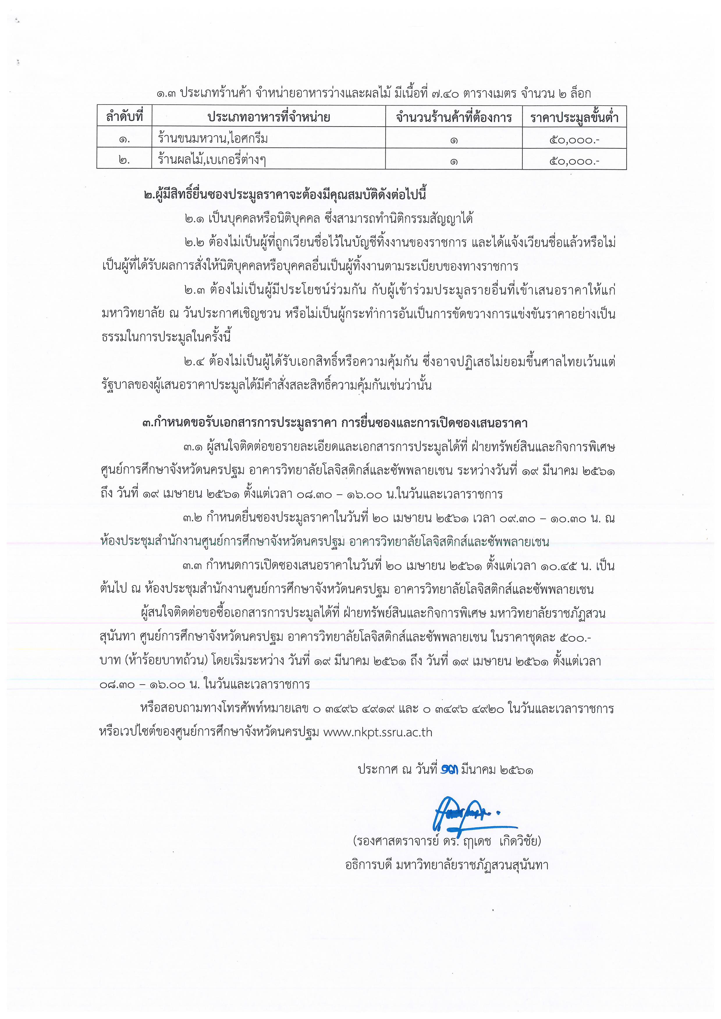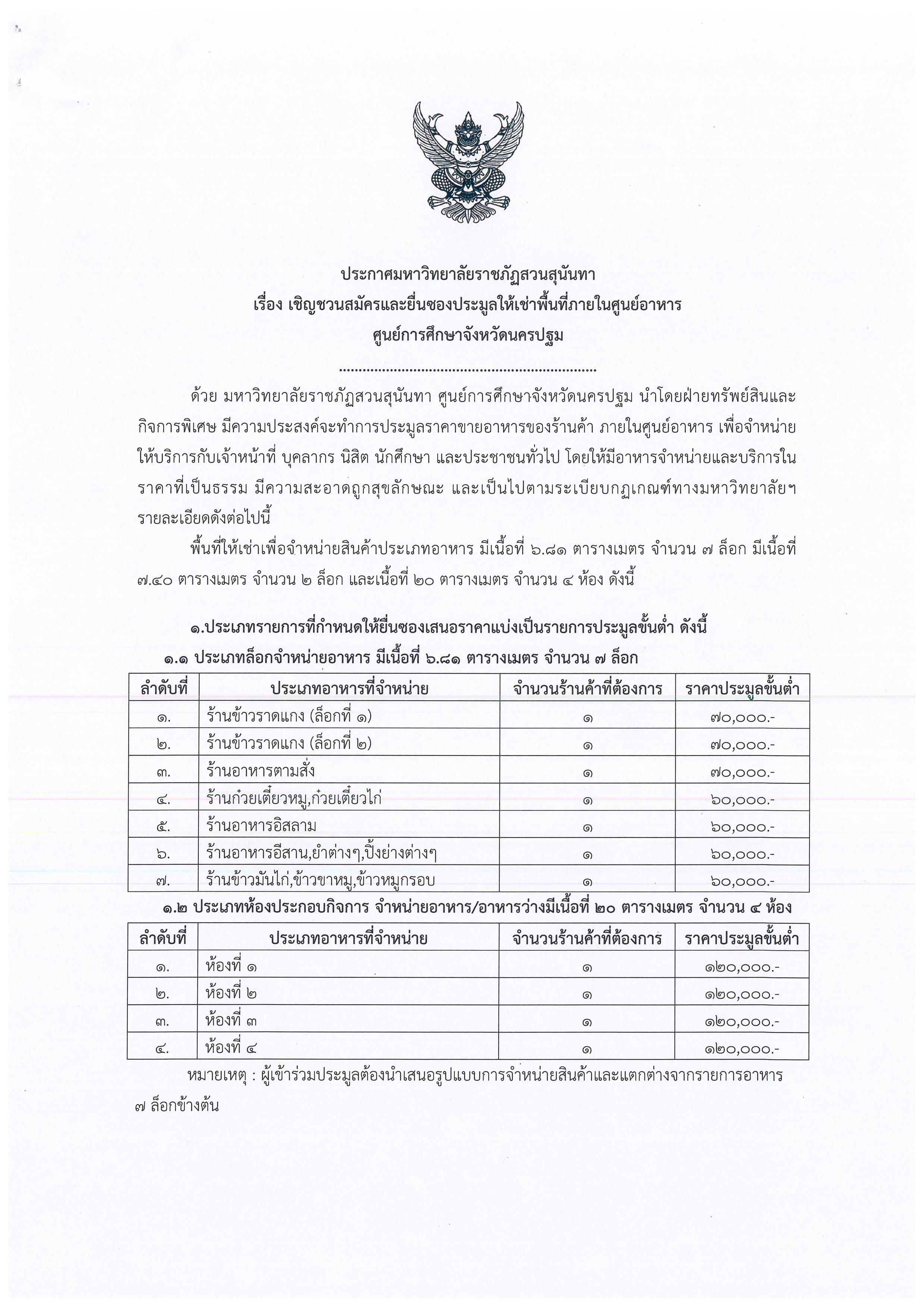 เชิญชวนสมัครและยื่นซองประมูลให้เช่าพื้นที่ภายในศูนย์อาหารศูนย์การศึกษาจังหวัดนครปฐม