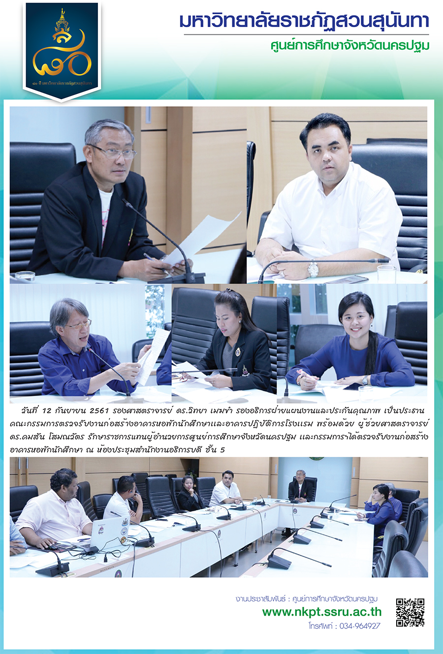 วันที่ 12 กันยายน 2561 รองศาสตราจารย์ ดร.วิทยา เมฆขำ รองอธิการฝ่ายแผนงานและประกันคุณภาพ เป็นประธานคณะกรรมการตรวจรับงานก่อสร้างอาคารหอพักนักศึกษาเเละอาคารปฏิบัติการโรงเเรม พร้อมด้วย ผู้ช่วยศาสตราจารย์ ดร.คมสัน โสมณวัตร รักษาราชการแทนผู้อำนวยการศูนย์การศึกษาจังหวัดนครปฐม เเละกรรมการฯได้ตรวจรับงานก่อสร้างอาคารหอพักนักศึกษา ณ ห้องประชุมสำนักงานอธิการบดี ชั้น 5